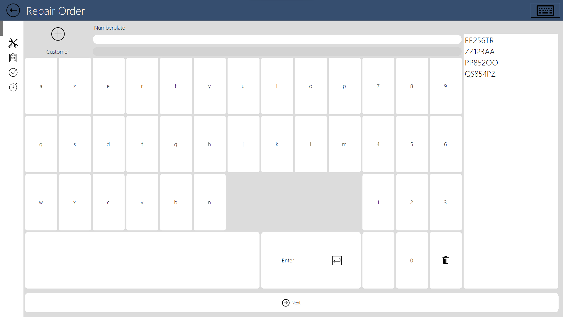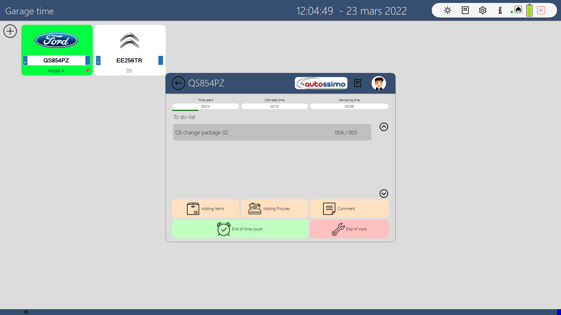 Het voertuig wordt aangemaakt in de database en automatisch voorzien van datum en tijd van aankomst. U selecteert het voertuig voor elke uitgevoerde taak, de stopwatch berekent dan de tijd voor mechanica, carrosserie of andere werkzaamheden. U kunt ook de uitgevoerde taken selecteren om altijd te weten wat er aan het voertuig is gedaan.