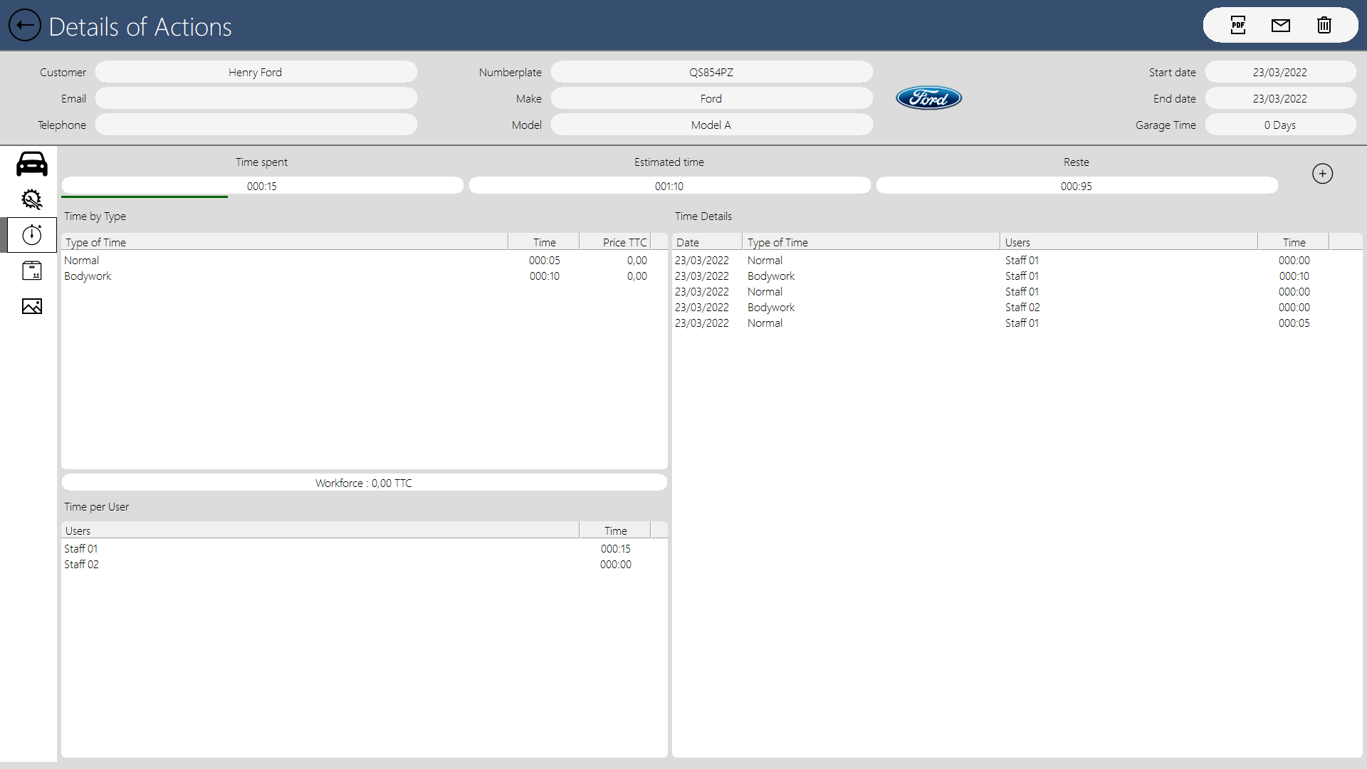 - Cálculo de tiempos de trabajo por vehículo y empleados.